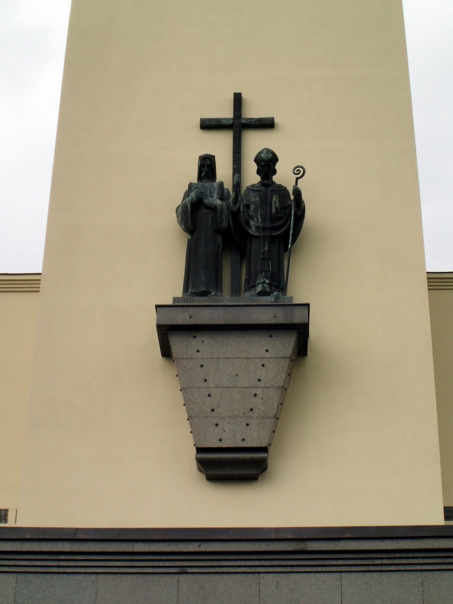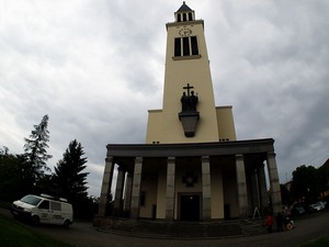 Kostel svatého Cyrila a Metoděje v Hejčíně Naše nejodvážnější se vzdálení se od centra hanácké metropole a zároveň první kostel. Prvním byl i pro Peťana, kterého zde pokřtili. Zcela symbolicky jsme sem dorazili právě od jeho rodičů. Moderní prvorepubliková stavba s velkými vitrážemi zrovna probíhá rekonstrukcí. K delšímu rozjímání nedošlo, neb nás odradila přítomnost televizních kamer. Tady bylo slavnostní zahájení. Je krátce po šesté hodině večerní. Mno, večerní, světla je pořád dost:-)